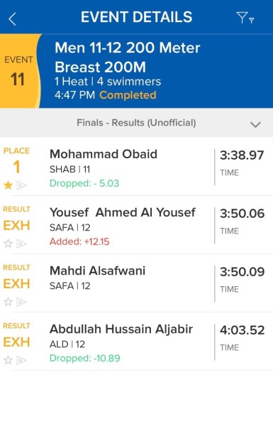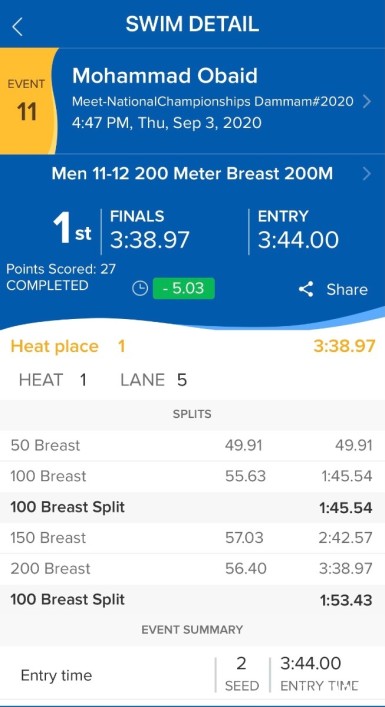 - المركز الأول (ذهبية) - 200 متر صدر - فئة 11-12