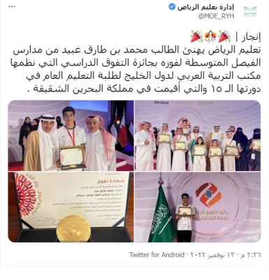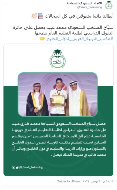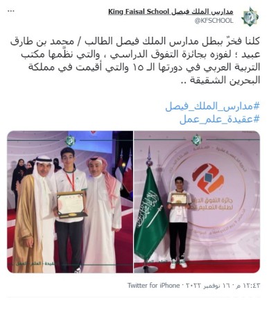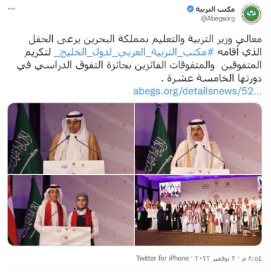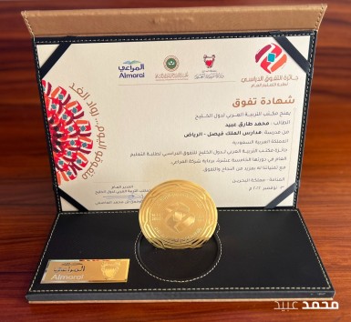 I was awarded the Academic Excellence Award for students of general education in its fifteenth session, which was held in Manama, Thursday, November 3, 2022, from the Arab Bureau of Education for the Gulf States in cooperation with the ministries of education in the Gulf states.